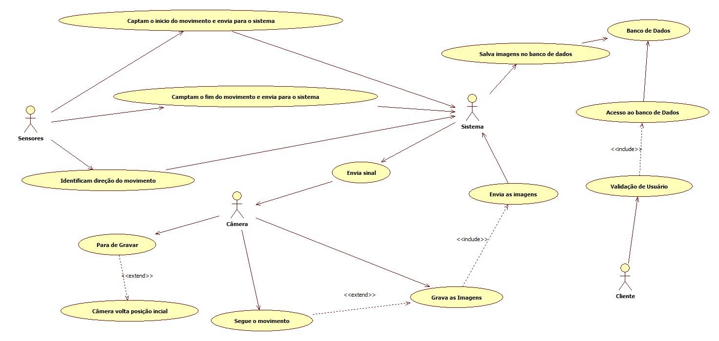 Nome do caso de uso: Gravar imagens Ator: Sensor e Câmeras. Pré-condições: Sensor estar funcionando, sistema estar ligado, câmeras estarem funcionando e todos estarem comunicando um com o outro corretamente. Pós-condições: Imagens salvas no Banco de Dados dos momentos onde houve movimento.