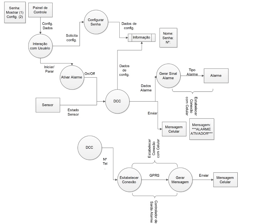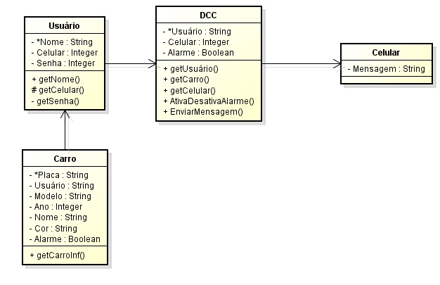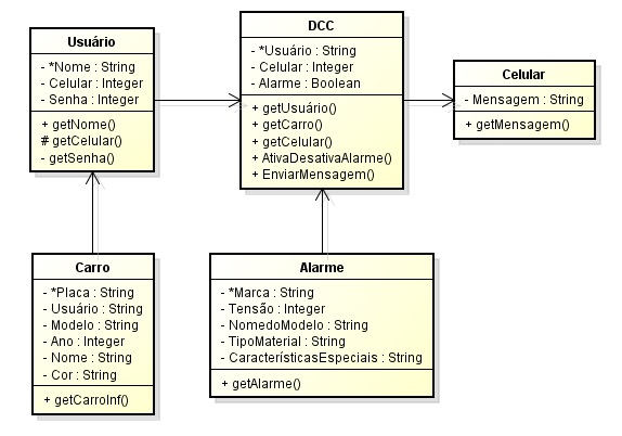 - O projeto DCC visa a implementação de um dispositivo de alarme residencial em um automóvel, sendo que após o acionamento do alarme do carro o aparelho entraria em contato diretamente com o telefone móvel do proprietário do veículo alertando-o sobre o incidente.