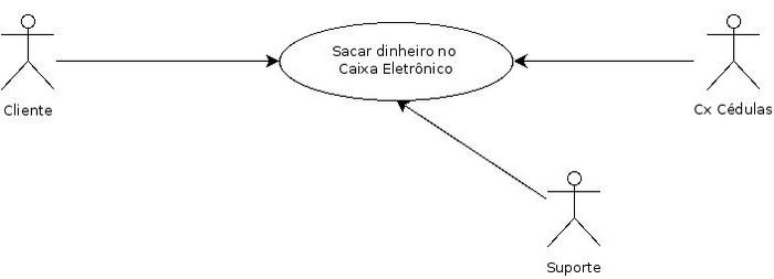 Identificação do Caso de Uso: UC1 Nome do Caso de Uso: Sacar dinheiro no caixa eletrônico Sumário: Este caso permite que o usuáro saque dinheiro no Caixa Eletrônico por meio do cartão magnético Ator: Cliente Pré-condições: Cliente possui acesso via cartão, senha atualizada e tem saldo positivo Pós-condições: Efetuada a transação, é debitado o lançamento no saldo da conta do cliente, Dinheiro é liberado.