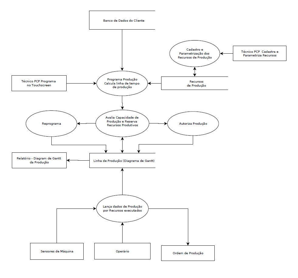 - Gerir Produção da OP: O sistema coleta dados da evolução da execução da OP, através de sistemas eletrônicos e sensores das máquinas, como também, através de entrada de dados da produção realizado pelos operários e ajusta as as Linhas de tempo de Produção, remanejando e permitindo a consulta do diagrama do fluxo produtivo.