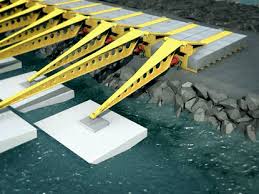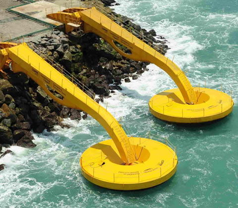 Esse outro mecanismo, consiste em instalar braços mecânicos em lugares de quebra-mares no litoral. Esses braços mecânicos, serão movimentados pelas ondas e servirão como uma bomba para impulsionar agua em uma câmara que submetera a agua a uma pressão similar a uma queda d’água de 400 metros, e assim movimentar um gerador.