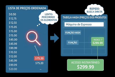 Com a tabela hash, a chave é convertida diretamente em um índice, permitindo acessar o valor de forma direta, sem percorrer toda a estrutura. Isso torna a busca muito mais eficiente.