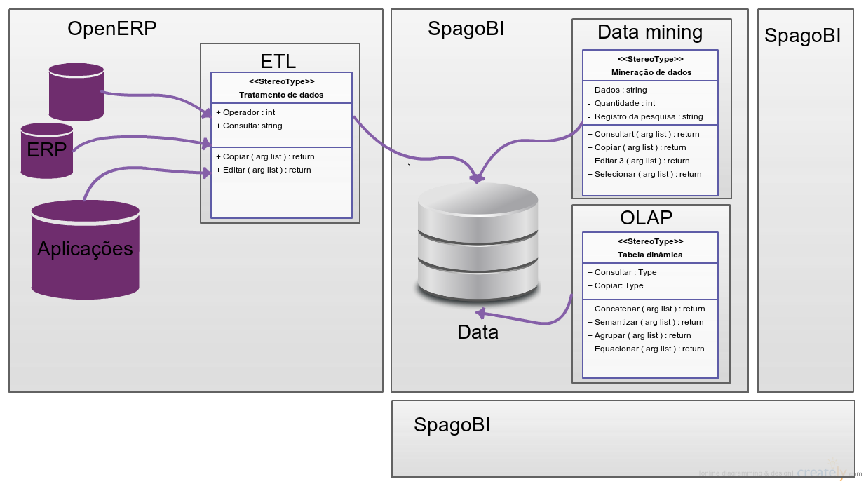 Esse projeto dispõem de Hardware - Esolvere: Um computador core i7, com firewall (caixa de gateway) e um cliente remoto, celeron. que suporta os requisitos: Utiliza-se dos softwares SpagoBI e OpenERP, por terem licenças (Mozilla Public License e GPL). Ambos softwares são opensource; O primeiro é uma ferramenta suite para BI o segundo é um ERP e CRM. As ferramentas são utilizadas como servidor-cliente, assim podendo ter acesso via browser. Isso viabiliza a versatilidade de OS exigidas nos requisitos. Com uma Aplicação - Esolvere, podemos confeccionar dentro do servidor OpenERP uma interface para capturar dados. Para armazenar as informações transnacionais, utilizamos de um Banco de Dados - Esolvere, PostgreSQL e um SGBD - Esolvere para gerenciar. Ao obter uma base de dados coesa, os dados passam por uma ETL - Esolvere,utilizando de um aplicativo (módulo) em OpenERP. O software SpagoBI tem acesso a esse banco, podendo fazer cópias para um Enterprise Data Warehouse (EDW) - Esolvere. Posteriormente fará os processos de "Data mining" e OLAP. Que nos garante ter um [DSS] e [EIS]. Trarão uma futura resposta aos Periféricos - Esolvere, os periféricos farão a função de sensorear e ativar sistemas.